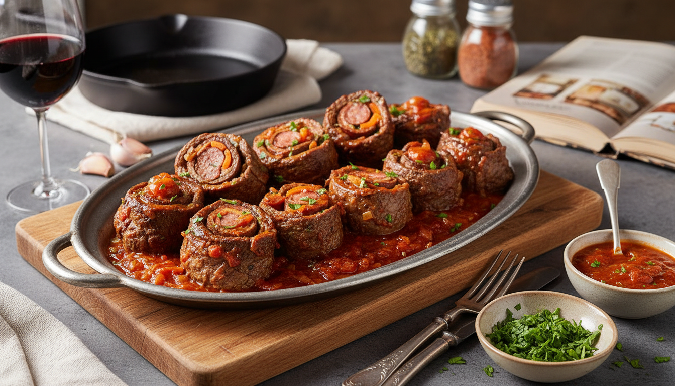Para quem busca uma opção com um perfil de sabor mais rústico e intenso, o bife à rolê recheado com linguiça calabresa e azeitonas é a escolha ideal. A gordura e os temperos da linguiça penetram na carne bovina durante o cozimento, criando um caldo extremamente aromático. As azeitonas picadas adicionam um toque de acidez que equilibra a riqueza do prato. É comum, nesta variação, adicionar um pouco de vinho tinto seco ao molho para aprofundar as notas de sabor.